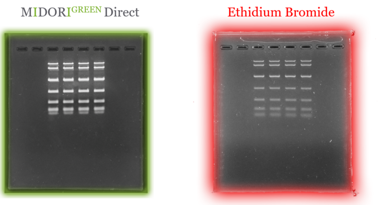 MIDORI Green Direct is a safe alternative to ethidium bromide for visualization of double-stranded DNA, single-stranded DNA, and RNA in agarose gels. In contrast to most other non-ethidium bromide based dyes, MIDORIGreen Direct is just added to your samples. The loading dye is already included.  You do not need to add any other loading dye to both gel matrix and running buffers